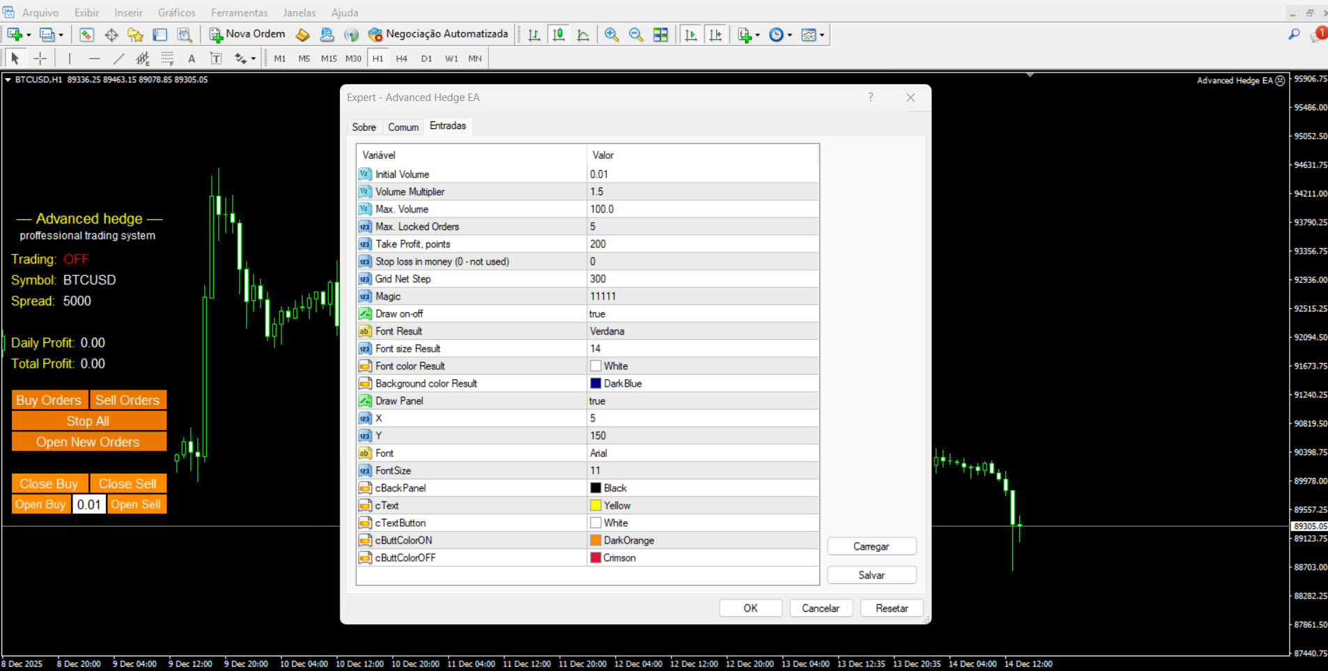 O Advanced Hedge EA oferece diversos parâmetros configuráveis, permitindo ajustar o risco e o comportamento do robô: