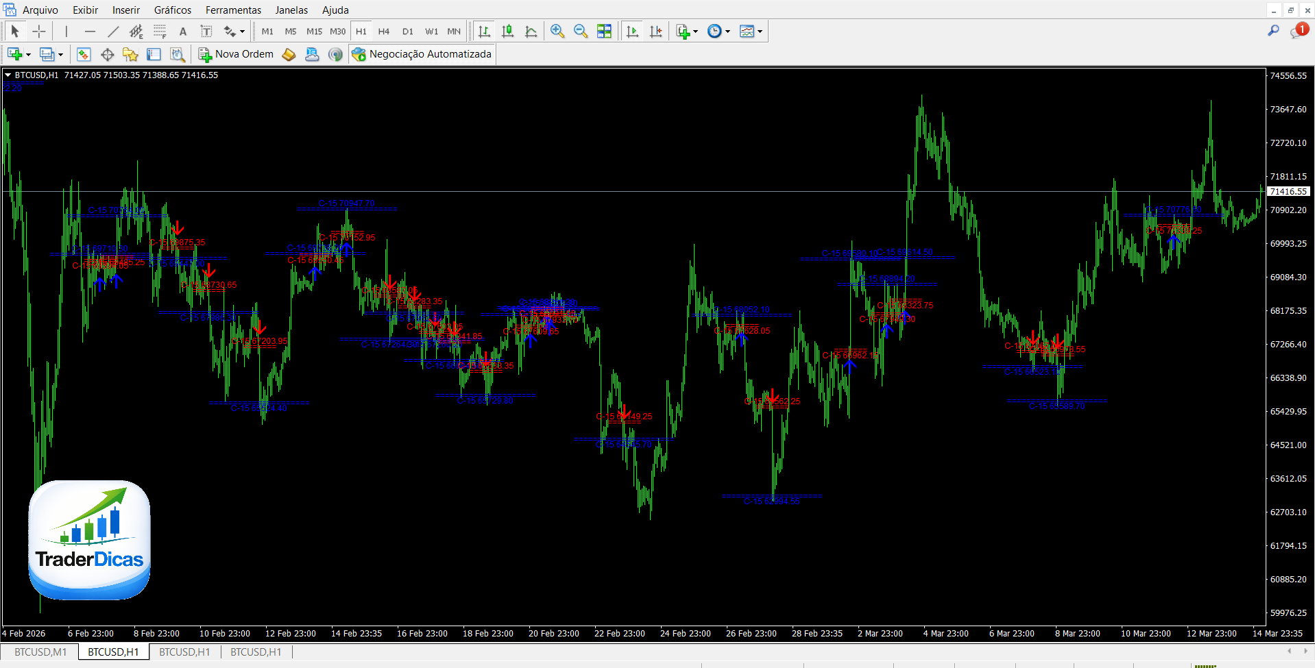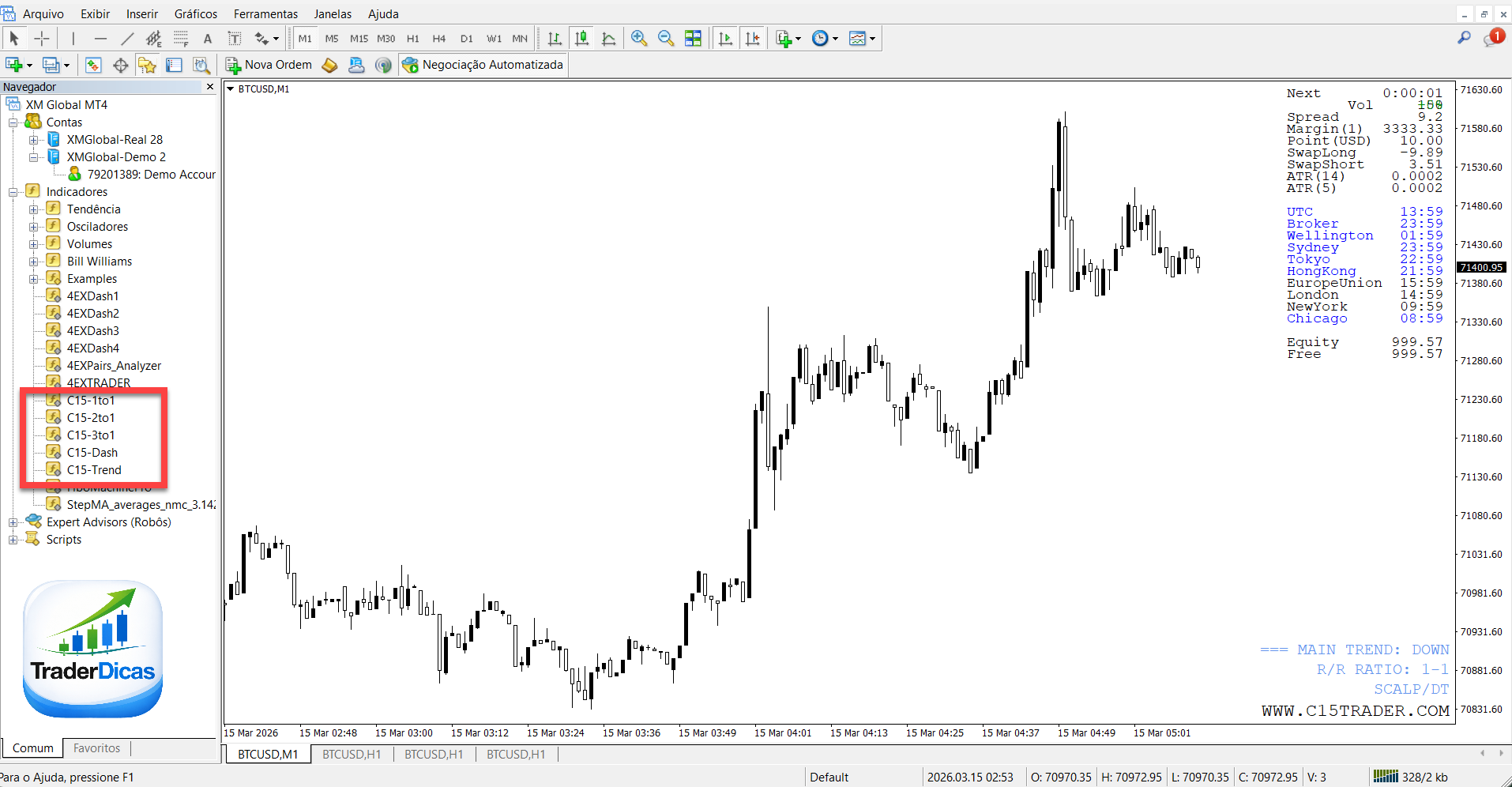 O pacote inclui diferentes versões do indicador C15 juntamente com indicadores auxiliares que ajudam na visualização das informações no gráfico.